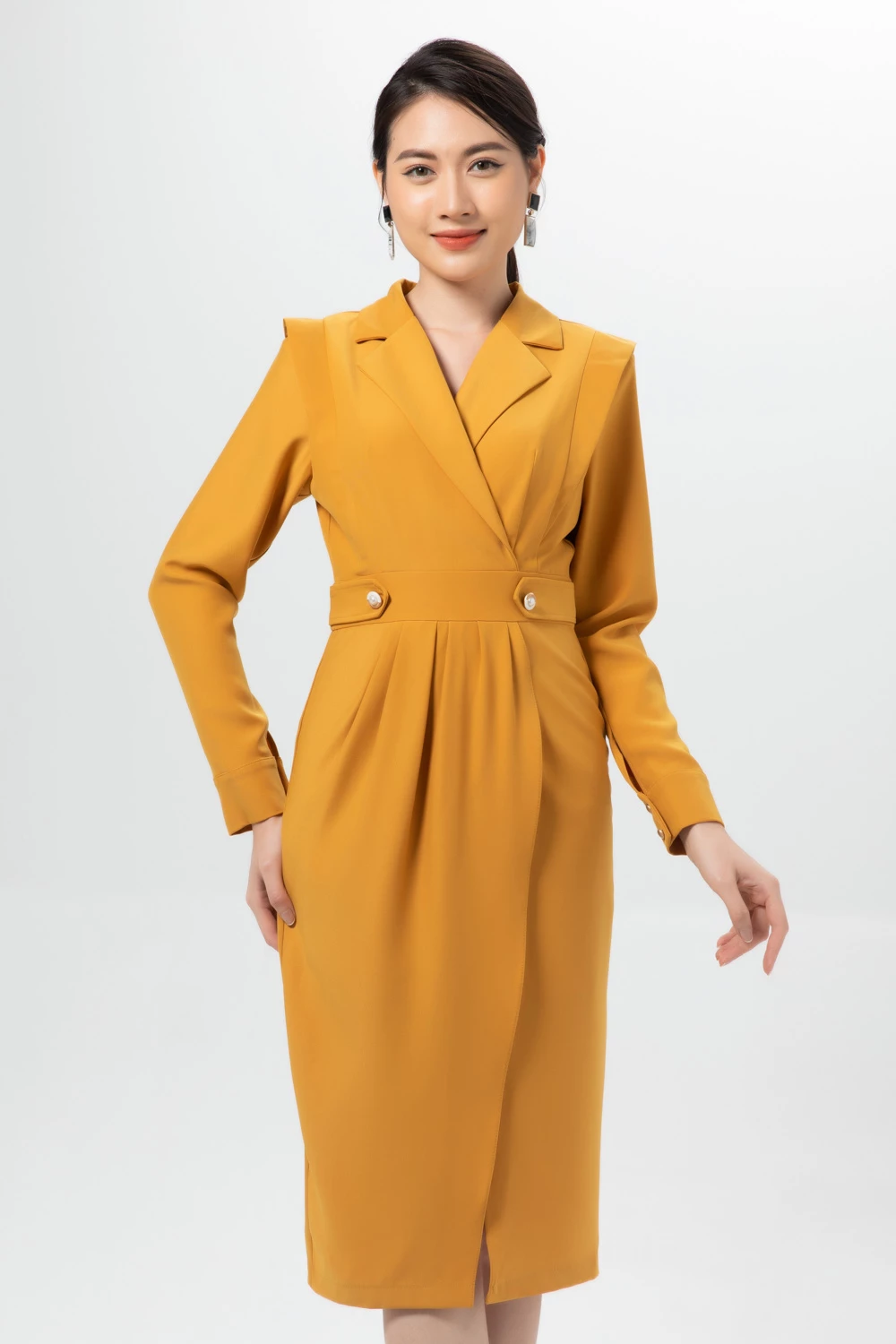 Đầm dài được làm từ chất liệu Tuysi. Cổ áo dáng vest. Phần eo được nhấn bằng đai khoảng 3cm. Chân dáng đắp chéo, độ dài qua gối. Phía sau có khóa kéo.