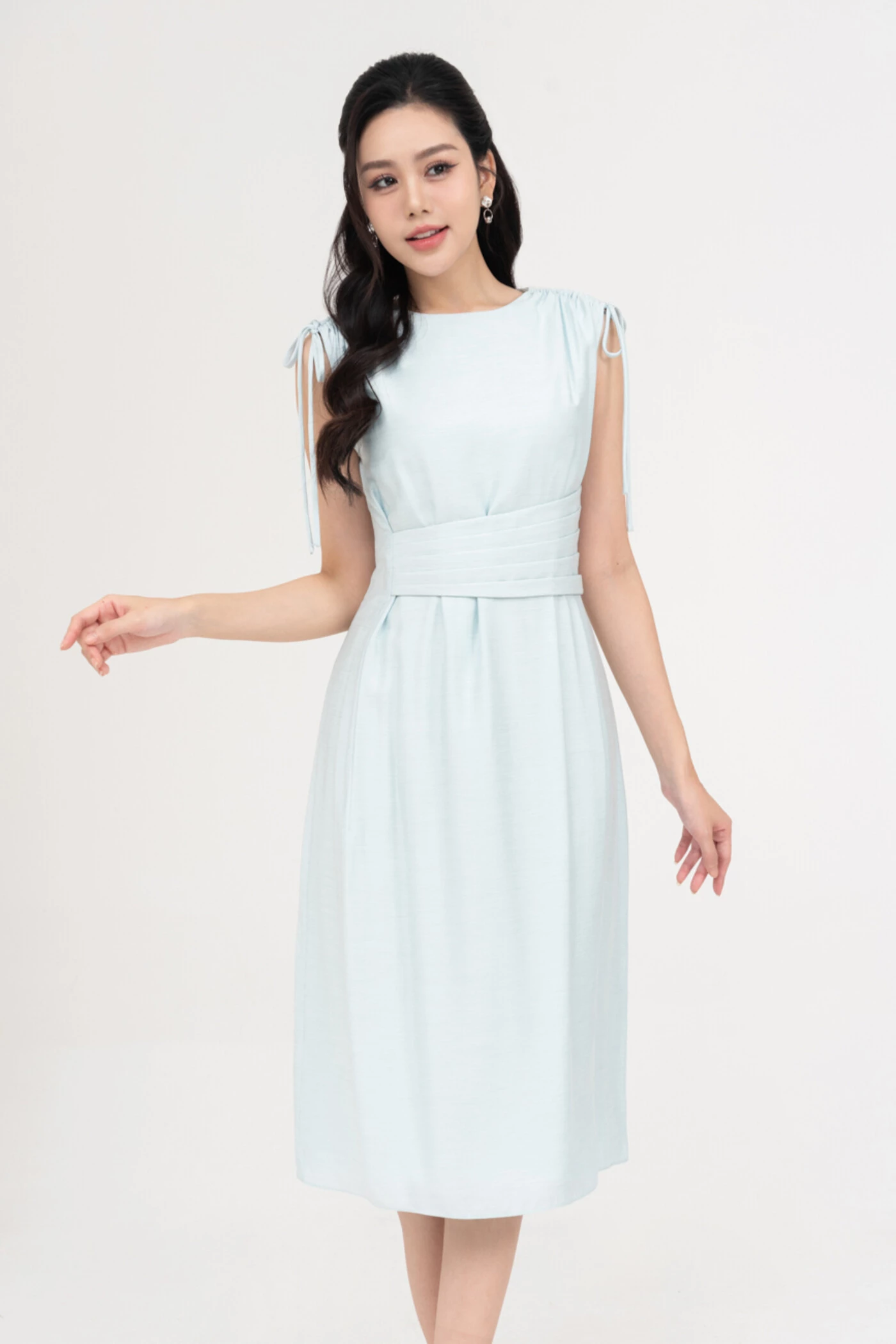 Đầm hai lớp, có độ dài qua gối, dáng bán nguyệt xếp li tạo độ xoè nhẹ và khi kế hợp cùng thiết kế cổ thuyền đã giúp item vừa che khuyết điểm tốt vừa tăng thêm phần dịu dàng, thanh cao. Phần tay liền tạo kiểu dây rút, nàng có thể điều chỉnh độ dài tay hay thắt nơ nhẹ nhàng.